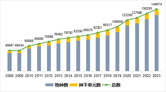 23年版に収録された生物種とその下位分類は14万8674種。うち動物は6万9658種、植物は4万7100種、真菌は2万5695種、原生動物は2566種、クロミスタは2381種、細菌は469種、ウイルスは805種だった。22年版に比べ、生物種は1万27種、下位分類は354種増えた。うち真菌は生物種が8202種、下位分類が320種増え、新規収録数が最も多かった。
