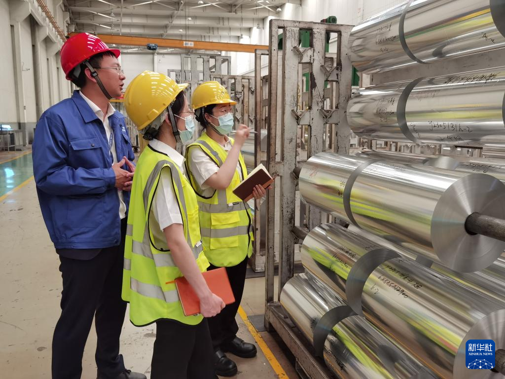 1日、上海神火アルミ箔(はく)の作業員と共に製品の品質を検査する上海税関の職員。(上海=新華社記者/呉宇)