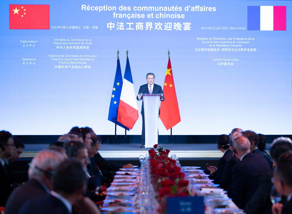中国の李強(り・きょう)国務院総理は21日夜、フランス・パリで開かれた中仏商工業界夕食会に出席し、あいさつした。(パリ=新華社記者/黄敬文)