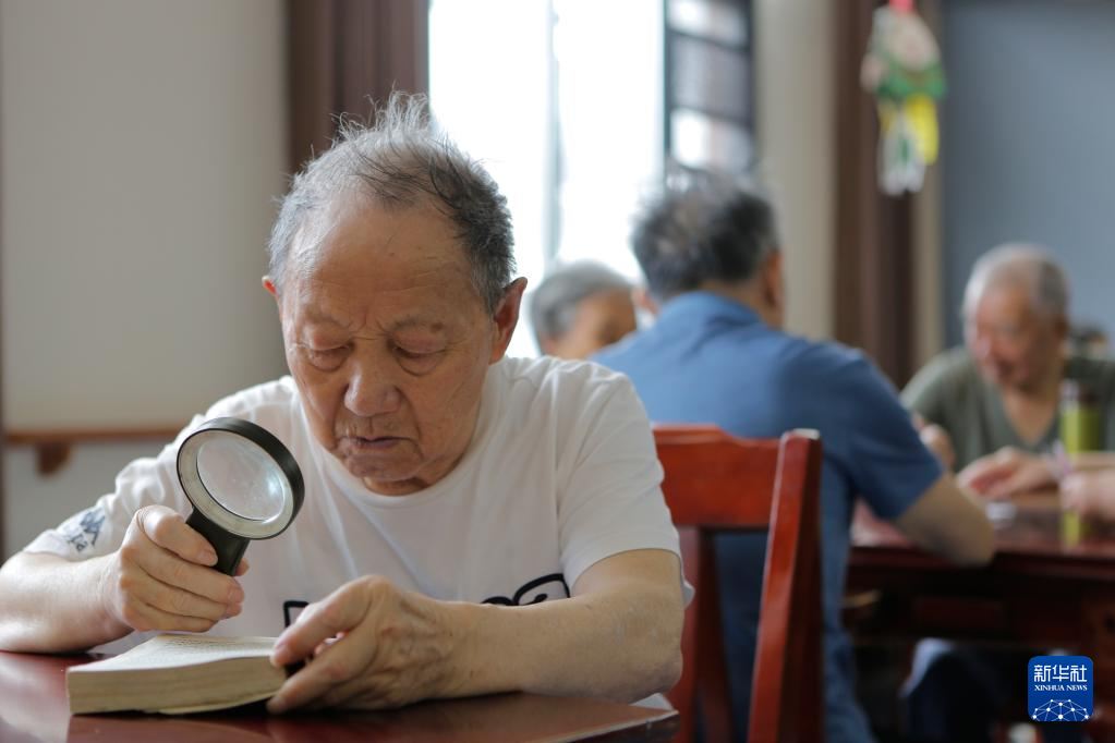 6月29日、如東県の申丞介護施設で読書する高齢者。(如東=新華社記者/柳文恵)pagebreak