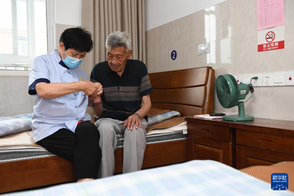 6月29日、如東県の掘港敬老院で高齢者の血圧を測るスタッフ。(如東=新華社記者/季春鵬)