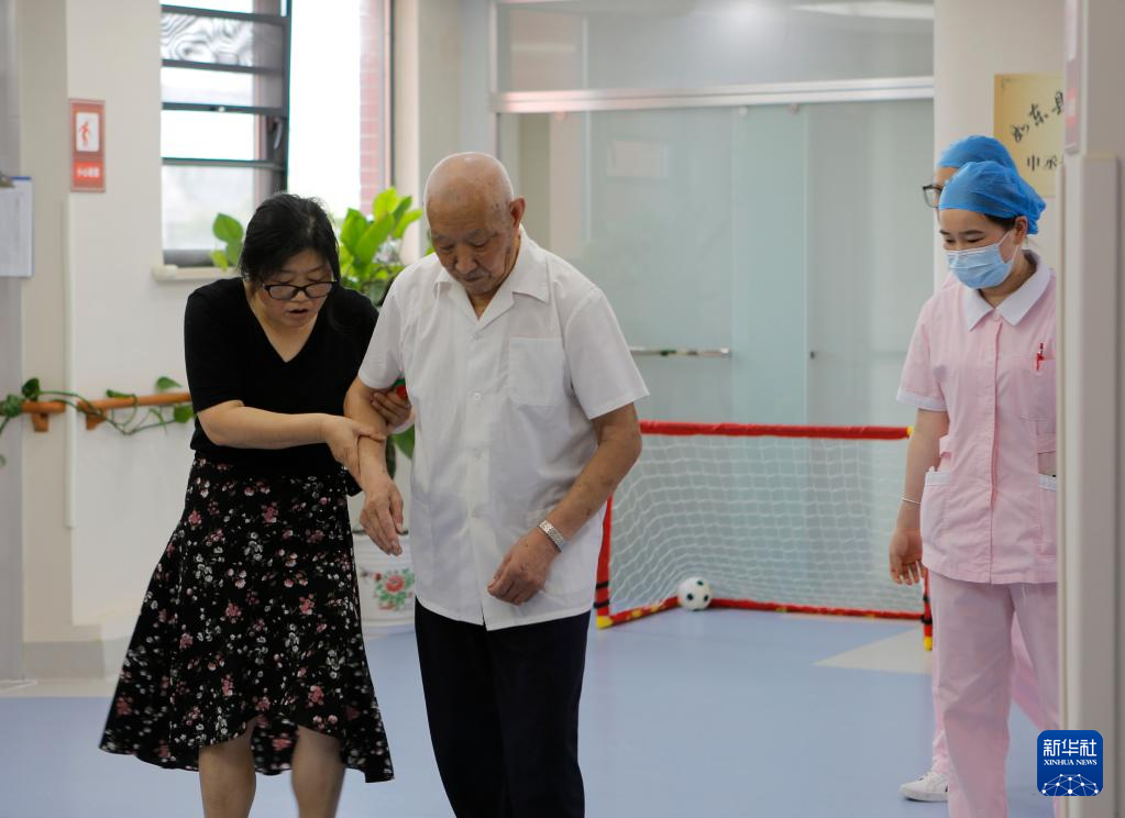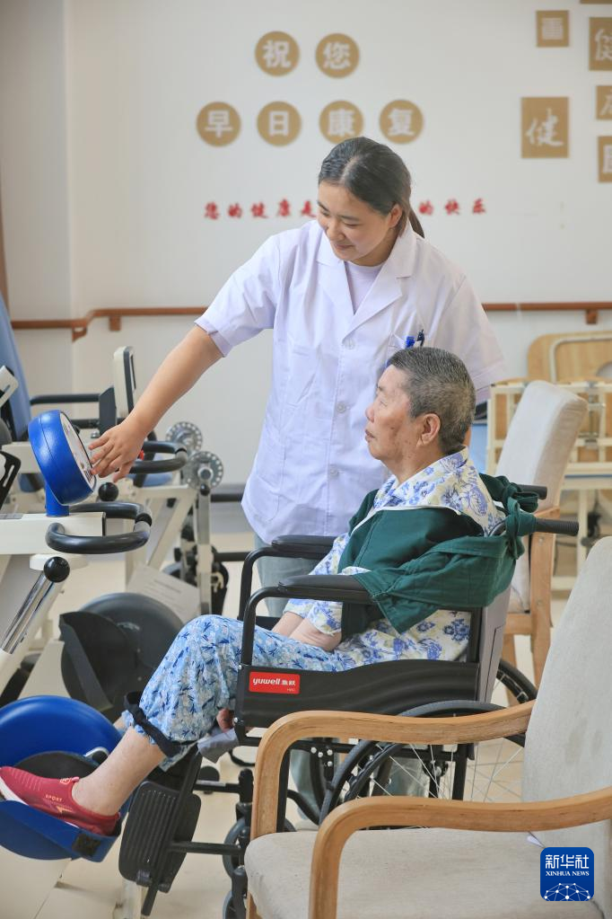 6月27日、如東県の申丞介護施設で高齢者のリハビリをサポートするスタッフ。(如東=新華社配信/許叢軍)pagebreak