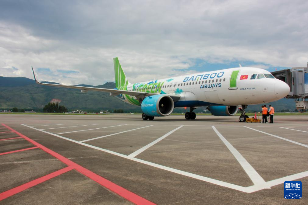 7月30日、麗江三義国際空港に到着したハノイ発のバンブー・エアウェイズ機。(麗江=新華社配信/張金誠)