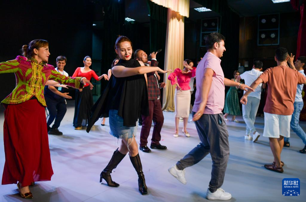 7月31日、新疆芸術劇院で同劇院のメンバーと一緒に歌と踊りを楽しむタジキスタン国立舞踊団「ローラ」の団員。(ウルムチ=新華社記者/王菲)