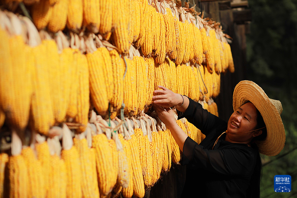 貴州省黔東南ミャオ族トン族自治州剣河県久仰鎮基佑村でトウモロコシを天日干しする村民。(2022年8月14日撮影、剣河=新華社配信)