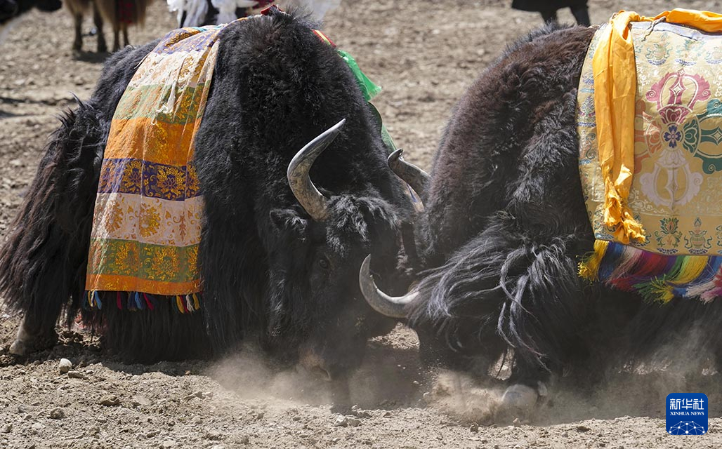 西藏自治区日喀則(シガツェ)市白朗(パナム)県者下郷で行われた闘牛祭り。(2019年9月9日撮影、シガツェ=新華社配信/孫非)