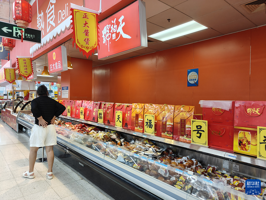 4日、北京市のスーパーで肉料理を選ぶ客。(北京=新華社記者/肖月)