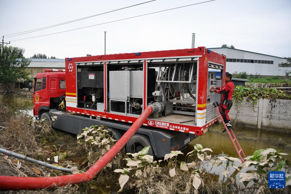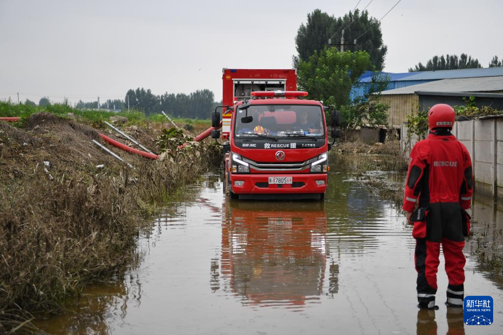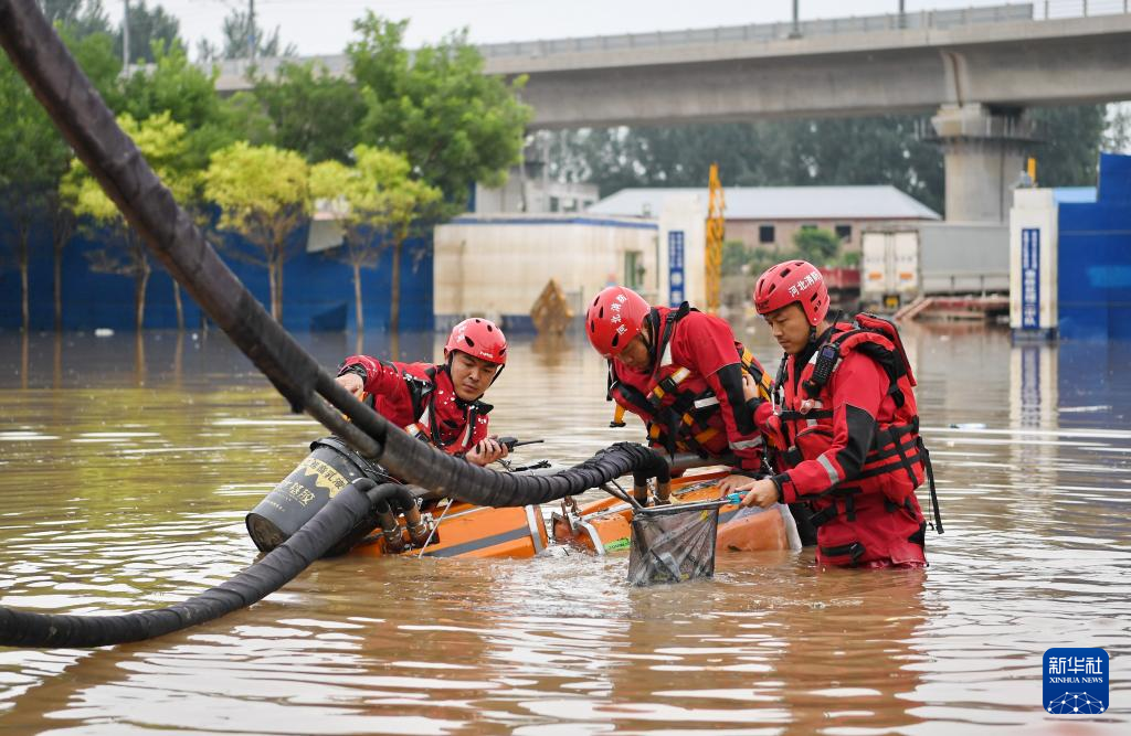 7日、涿州市内で排水作業にあたる唐山市消防救援支隊の隊員。(涿州=新華社記者/牟宇)pagebreak