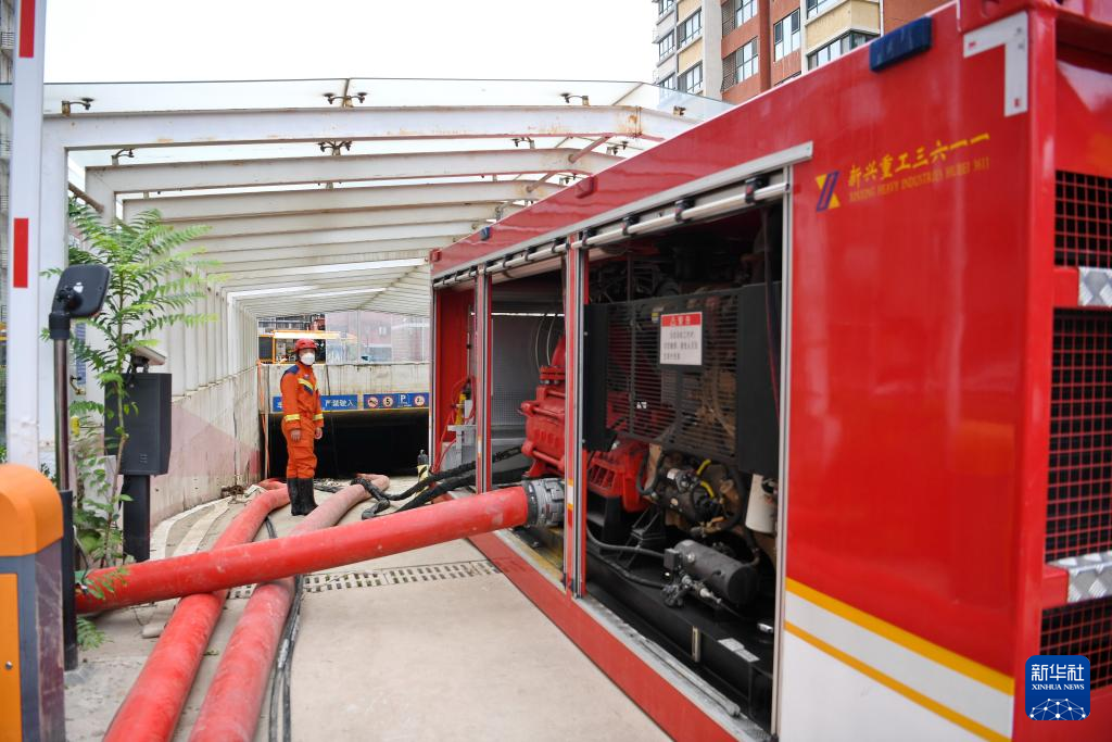 7日、涿州市内の地下駐車場を排水する設備。(涿州=新華社記者/牟宇)pagebreak