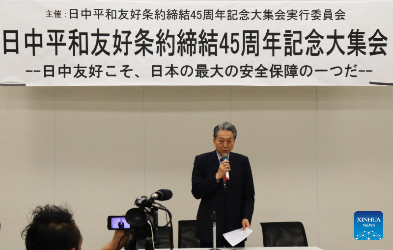 10日、中日平和友好条約締結45周年記念集会であいさつする日本の鳩山由紀夫元首相。(東京=新華社記者/楊光)