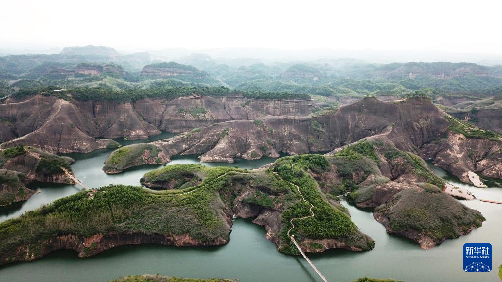 同風景区では赤い堆積岩が隆起した丹霞地形と水辺の風景が同居し、見事な景観を形作っている。pagebreak