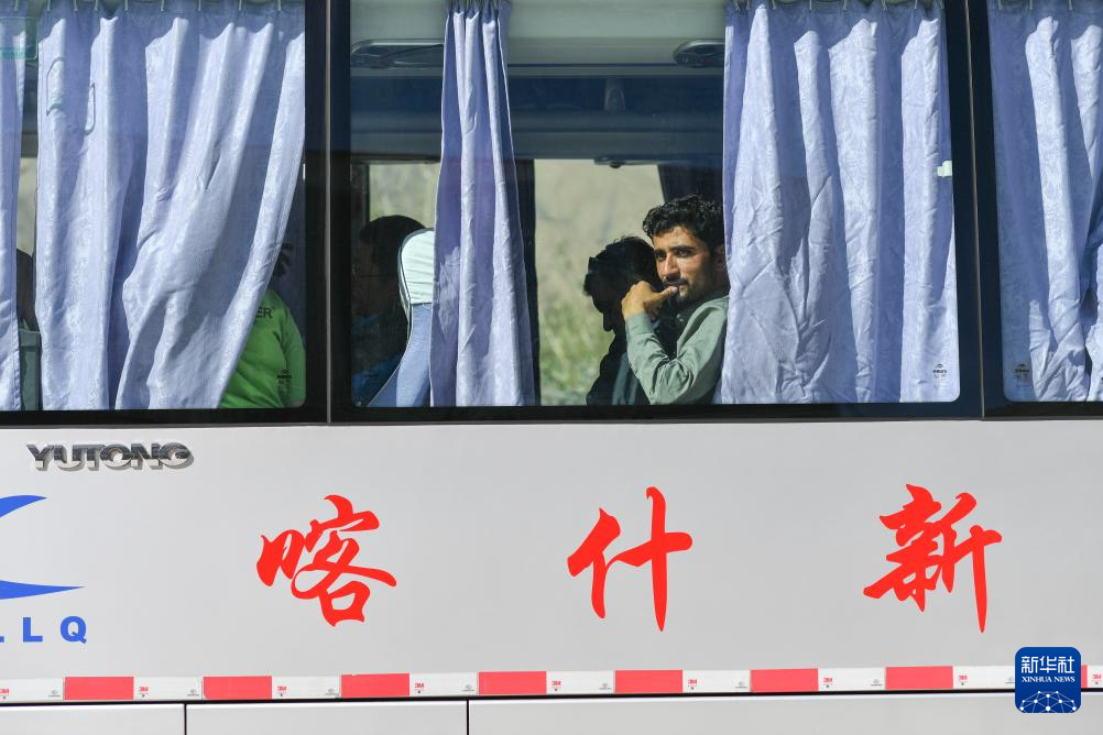 8月29日、新疆クンジュラブ口岸で、国際シャトルバスに乗るパキスタンのビジネスマン。(タシュクルガン=新華社記者/胡虎虎)