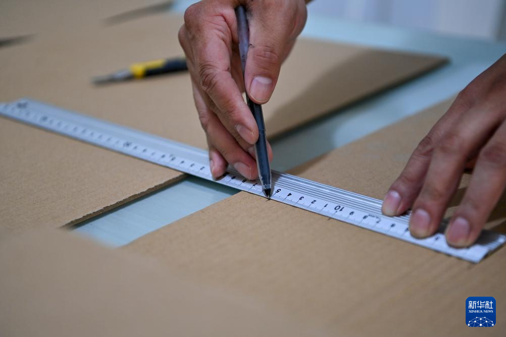 工房で段ボールのサイズを測る王帥棟さん。(8月1日撮影、太原=新華社記者/楊晨光)