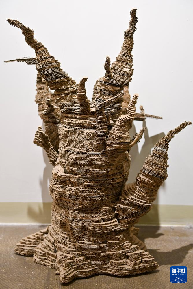 王帥棟さんが「洪洞大槐樹(山西省洪洞県にあるエンジュの古木)」をモデルに創作した段ボール作品。(8月1日撮影、太原=新華社記者/楊晨光)