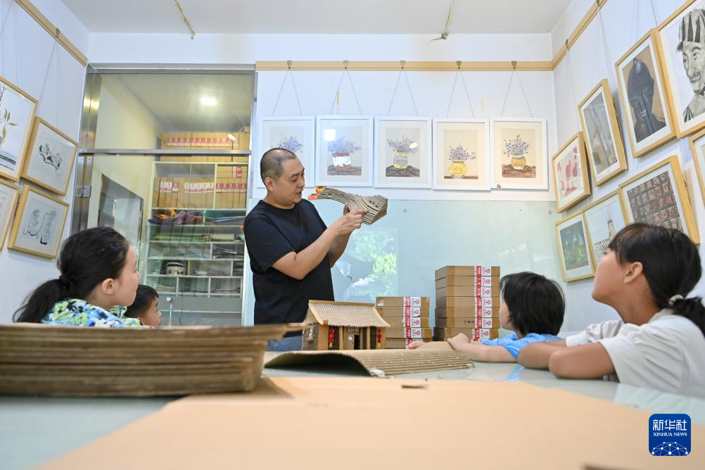 工房で作品の背景となる地理の知識を子どもたちに教える王帥棟さん。(8月4日撮影、太原=新華社記者/楊晨光)