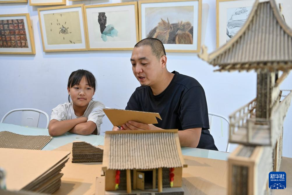 工房で娘に段ボールの裁断技術を教える王帥棟さん。(8月4日撮影、太原=新華社記者/楊晨光)