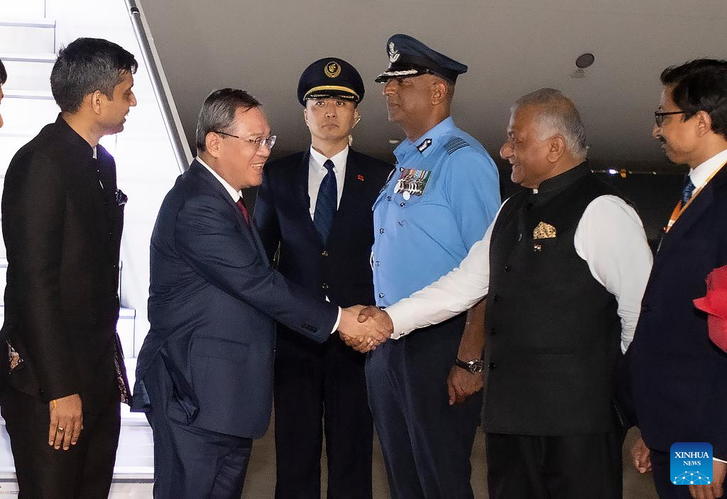 8日、G20首脳会議に出席するため、チャーター機でニューデリーのパラム空軍基地に到着した李強国務院総理(左から2人目)。(ニューデリー=新華社記者/李濤)