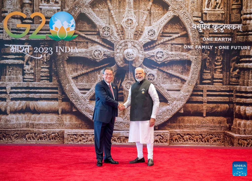 9日、握手を交わす李強国務院総理(左)とインドのモディ首相。(ニューデリー=新華社記者/李濤)