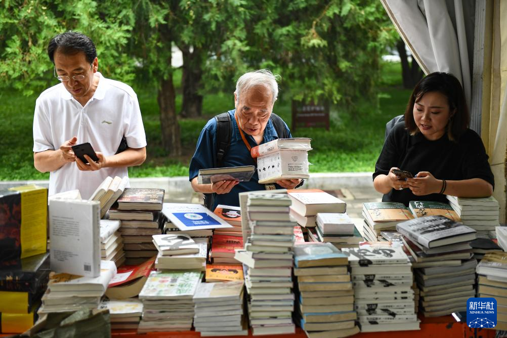 8日、地壇の書籍販売会で本を選ぶ市民。(北京=新華社記者/陳鍾昊)