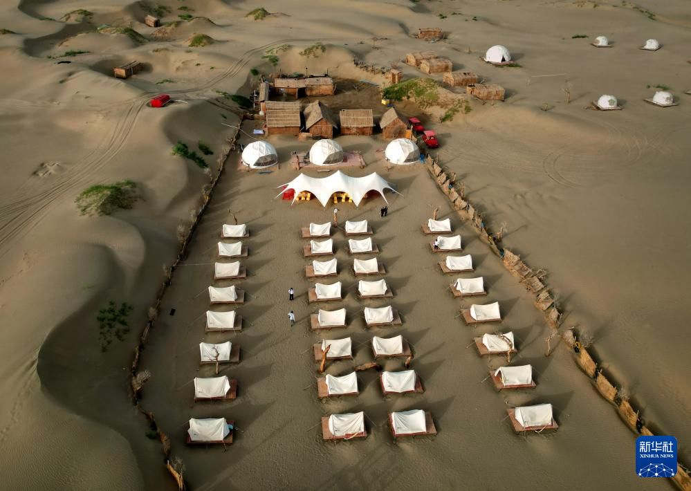 7日、マルキト県の北緯39度砂漠風景区にあるキャンプ場。(小型無人機から、カシュガル=新華社記者/李安)