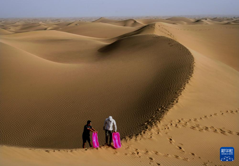 7日、マルキト県の北緯39度砂漠風景区で、サンドスキー体験の準備をする観光客。(カシュガル=新華社記者/李安)