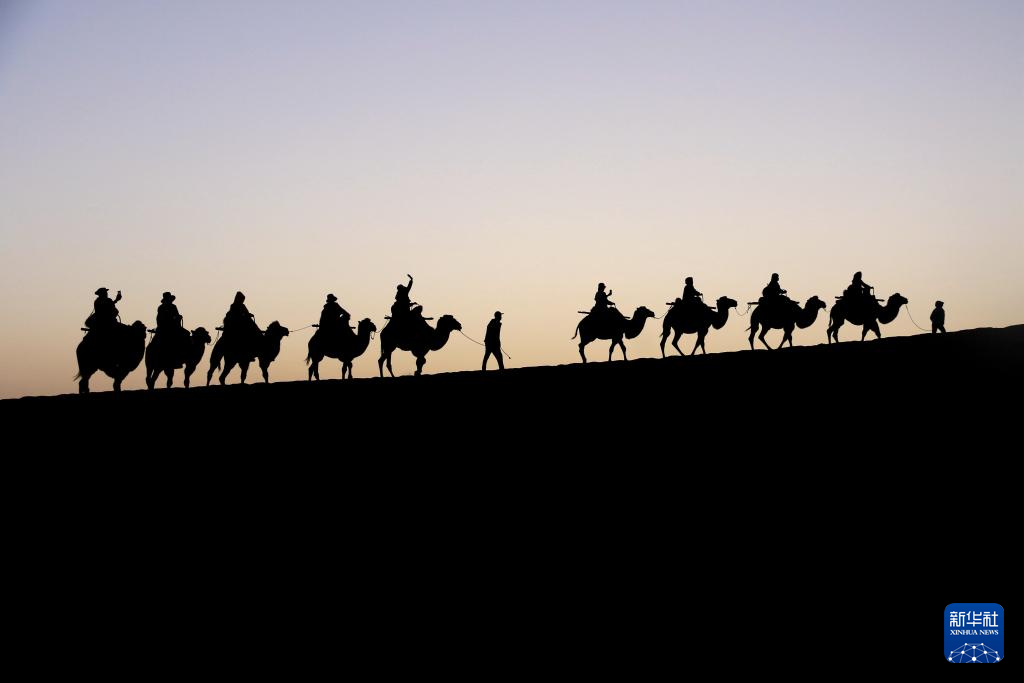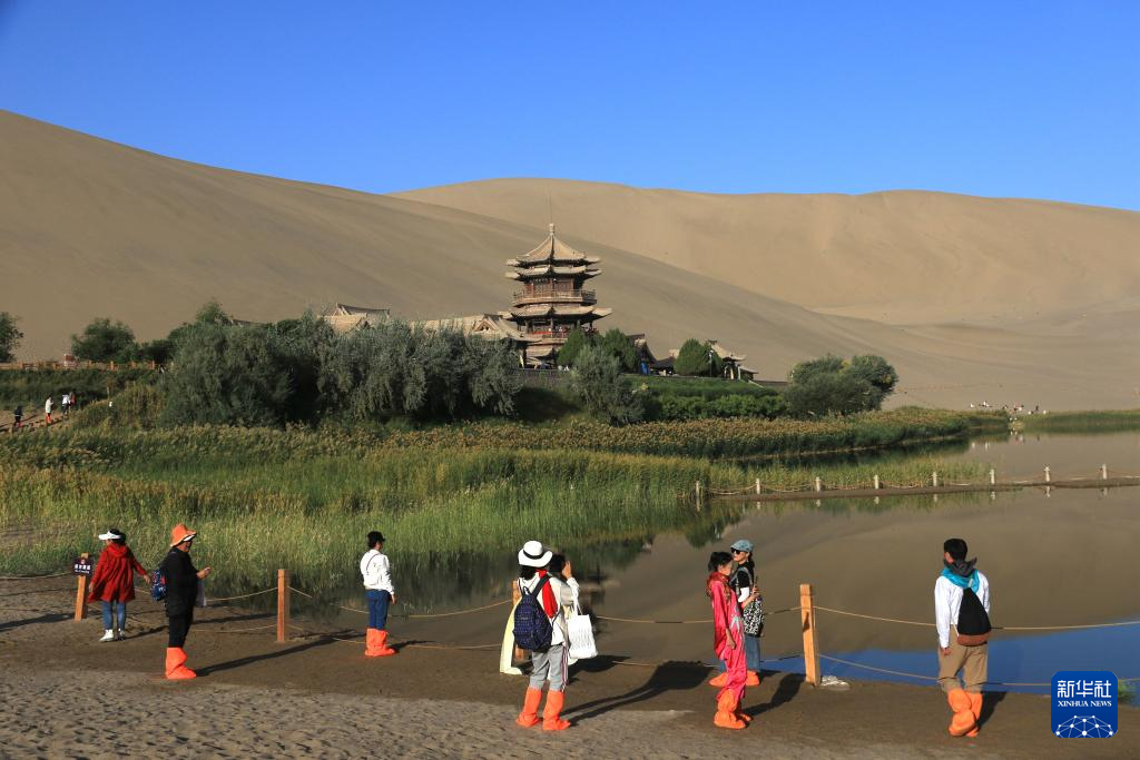 11日、甘粛省敦煌市の鳴沙山・月牙泉風景区を楽しむ観光客。(敦煌=新華社配信/張暁亮)