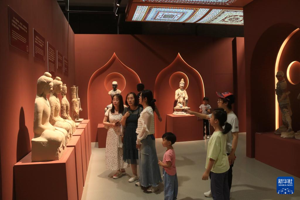 10日、甘粛省の敦煌国際会展中心(コンベンション・エキシビションセンター)で敦煌文化の企画展を見学する観光客。(敦煌=新華社配信/張暁亮)