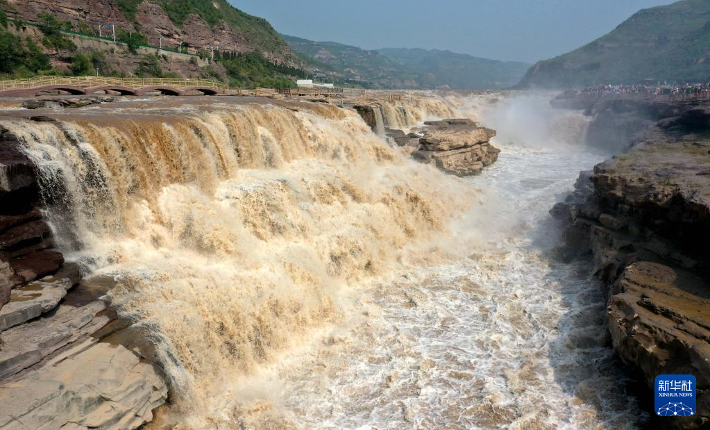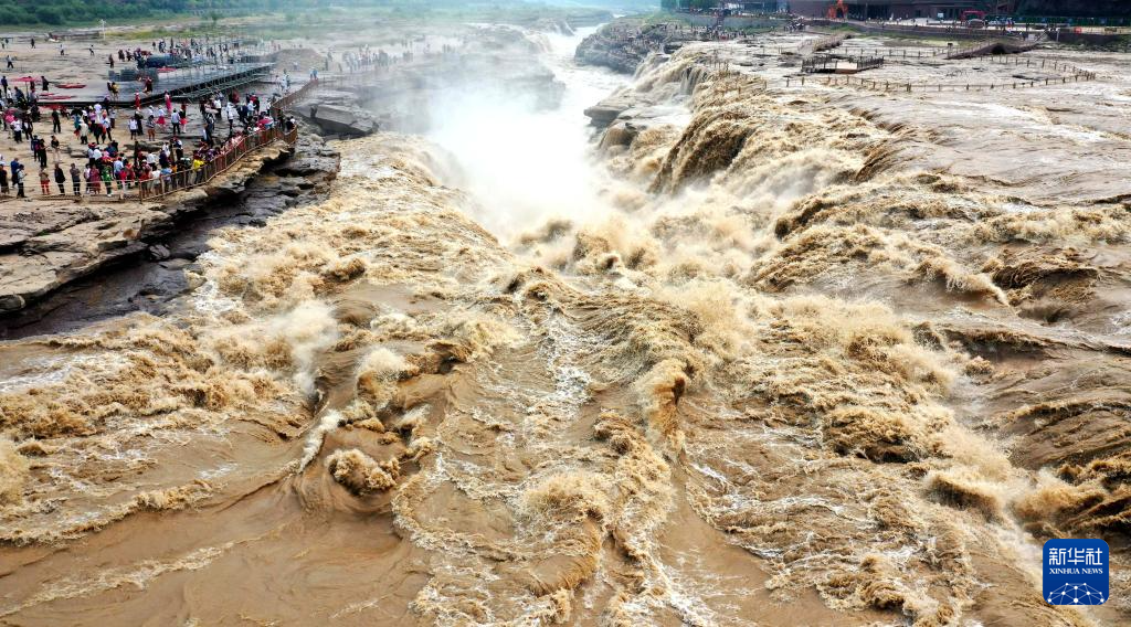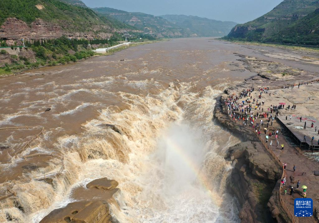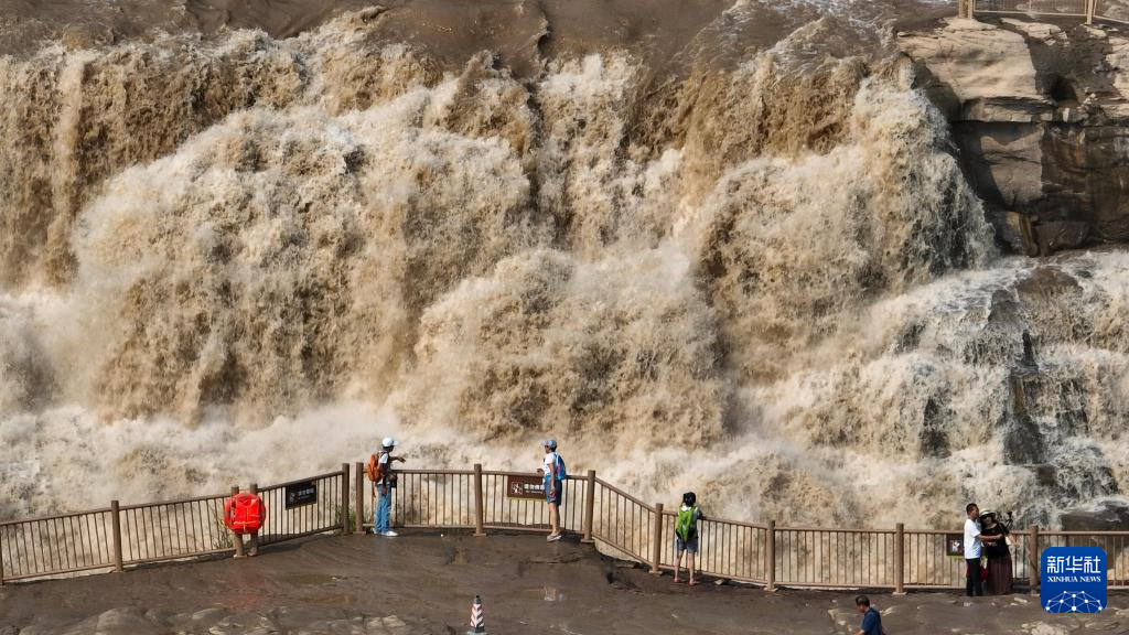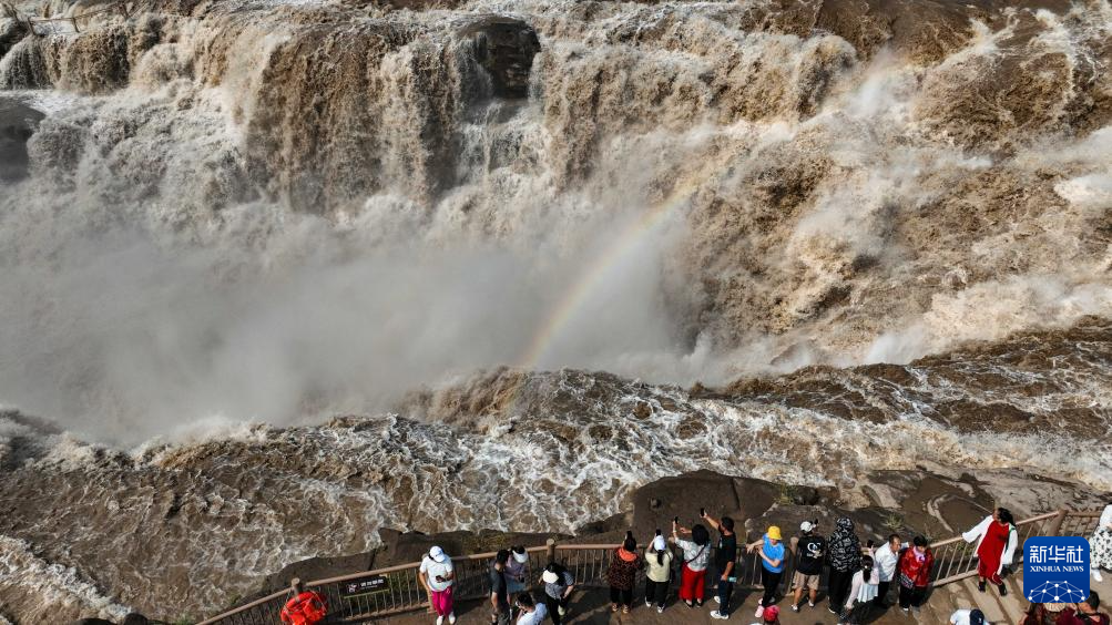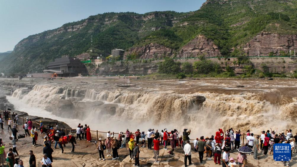 【新華社臨汾9月16日】中国山西省と陝西省の境に位置する黄河壺口瀑布でこのほど、上流の降雨とダム放水の影響を受け、大小の滝が一つの流れをつくり出した。壮大な光景を見ようと多くの観光客が訪れている。