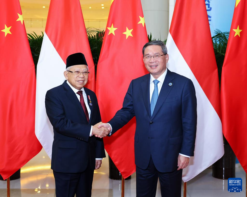 中国の李強(り・きょう)国務院総理は16日午後、第20回中国・東南アジア諸国連合(ASEAN)博覧会出席のため訪中したインドネシアのマアルフ副大統領と広西チワン族自治区南寧市で会見した。(南寧=新華社記者/劉彬)