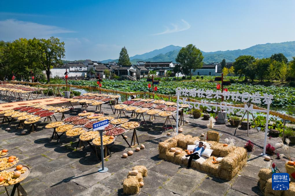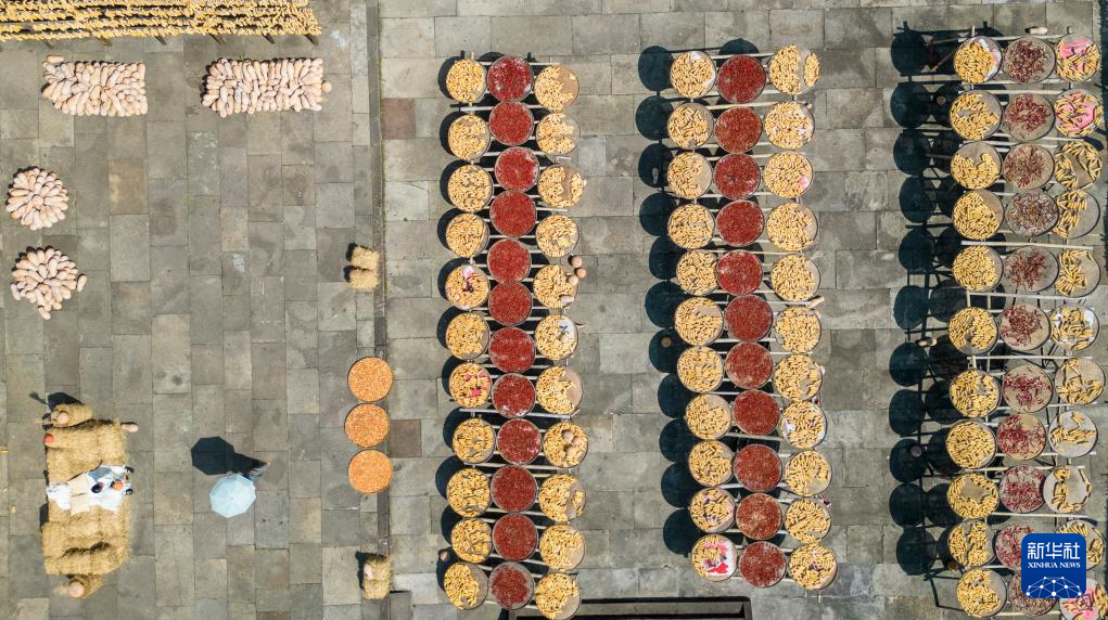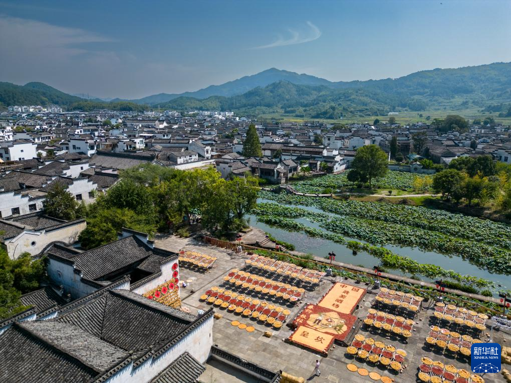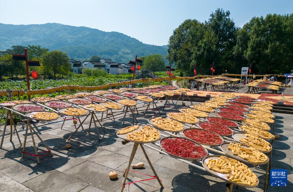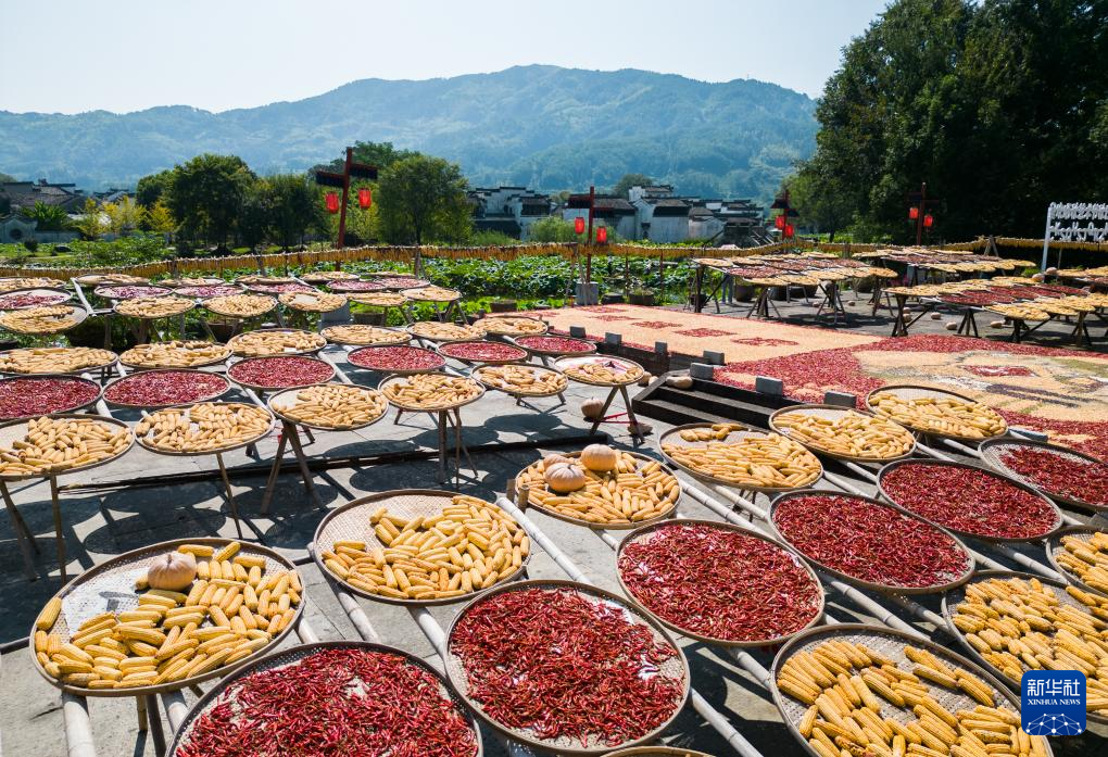 【新華社黄山9月20日】中国安徽省黄山市徽州区の呈坎(ていかん)古村には、古くから秋の収穫物を天日干しする習慣がある。村民らが広場に集めた色とりどりの作物は地元の風物詩として多くの観光客を魅了している。