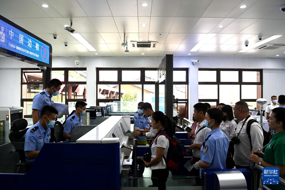 15日、中越国境の徳天瀑布(バンゾック滝)観光協力区で、出国手続きの列に並ぶ観光客。(南寧=新華社記者/曹禕銘)