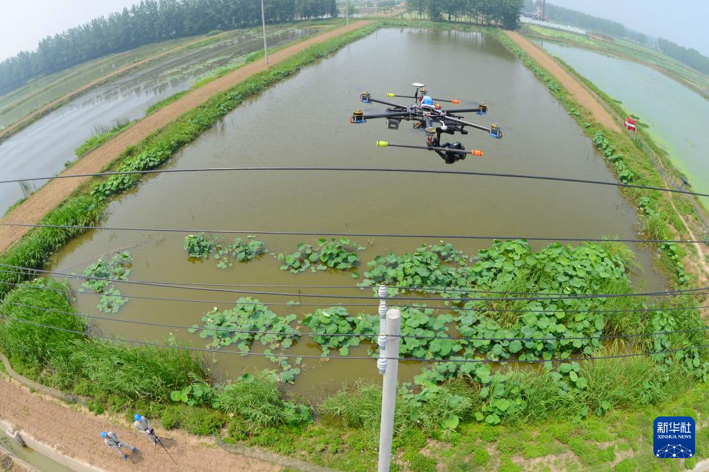17日、農村の観光地で送電線の巡回点検を行う国網淮安供電の小型無人機。(淮安=新華社配信)