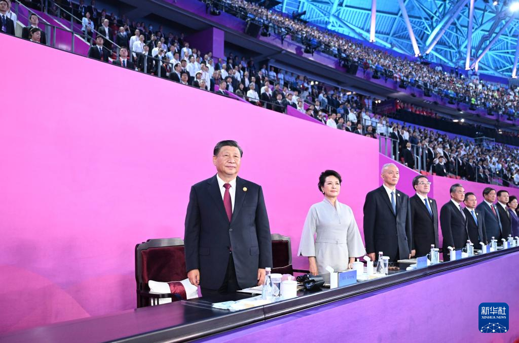 中国の習近平(しゅう・きんぺい)国家主席は23日夜、浙江省杭州市で行われた第19回アジア競技大会(杭州アジア大会)の開会式に出席し、開会を宣言した。写真は開会式に出席する習近平、蔡奇(さい・き)、丁薛祥(てい・せつしょう)各氏ら党と国家の指導者。(杭州=新華社記者/謝環馳)