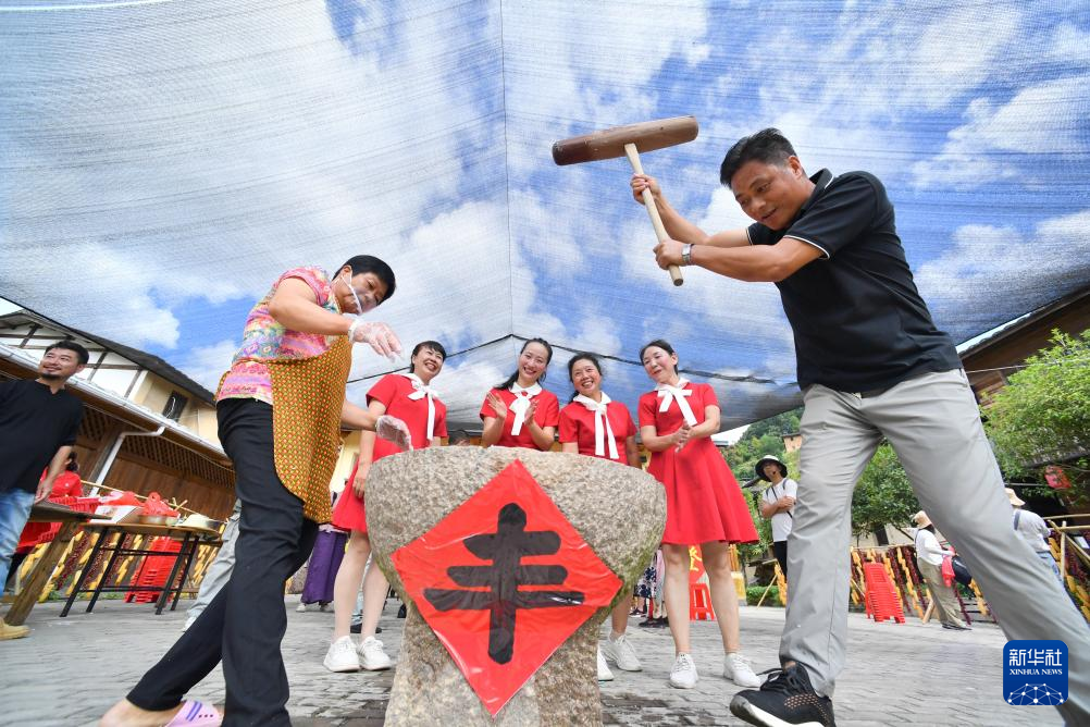 23日、桂峰村の「晒秋」文化祭で、「糍粑(ツーバ)」と呼ばれる餅菓子作りを体験する観光客。(尤渓=新華社記者/姜克紅)pagebreak