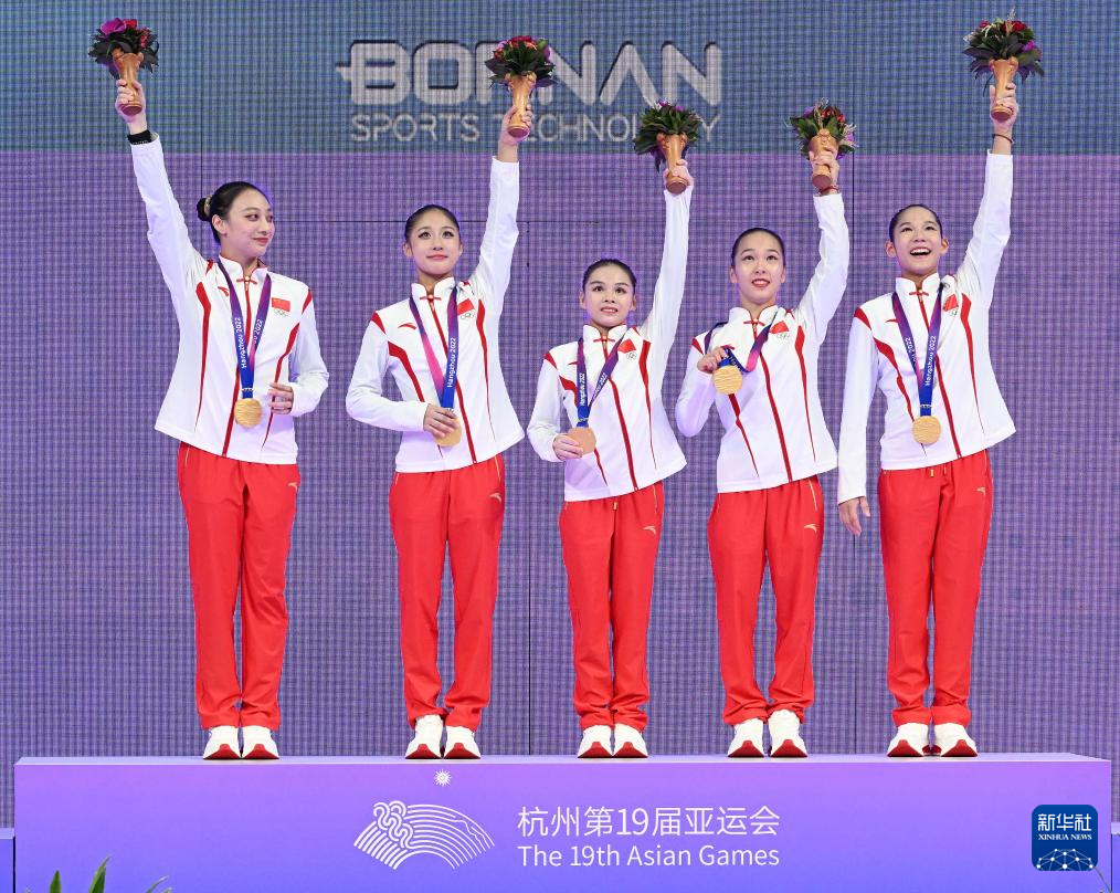25日、表彰式に臨む中国代表。(杭州=新華社記者/程敏)