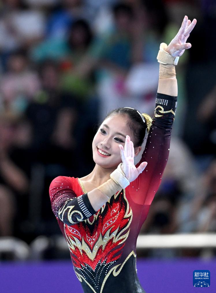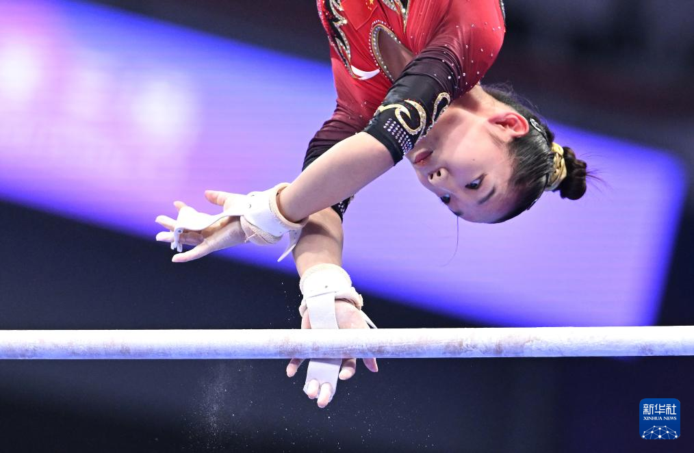 25日、段違い平行棒の演技に臨む中国の唐茜靖。(杭州=新華社記者/程敏)