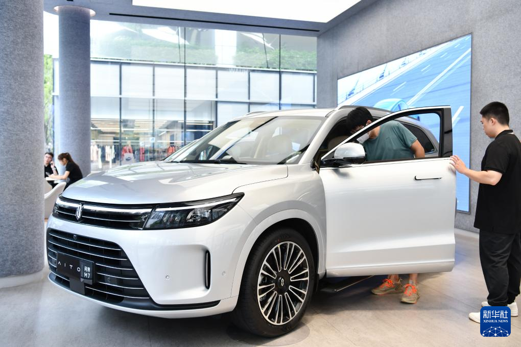 11日、ファーウェイの深圳旗艦店で「問界(AITO)M7」に試乗する客。(深圳=新華社記者/梁旭)