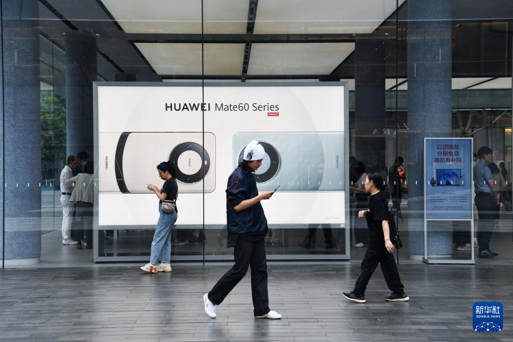 11日、ファーウェイの深圳旗艦店前を通行する人々。(深圳=新華社記者/梁旭)