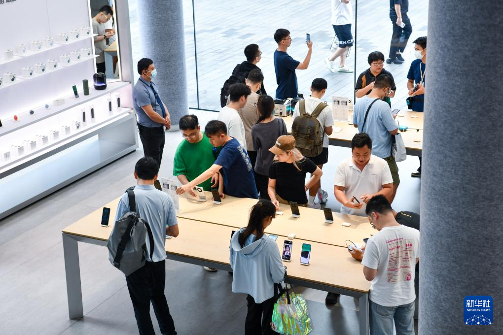 11日、ファーウェイの深圳旗艦店でスマートフォンを選ぶ客。(深圳=新華社記者/梁旭)