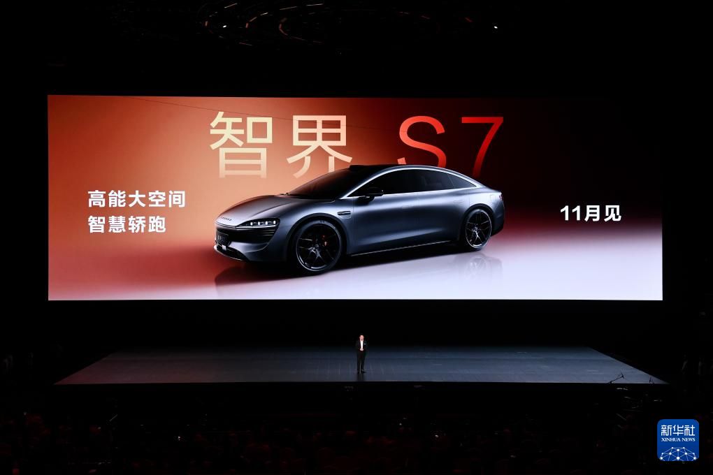 25日、新製品発表会で披露された「智界S7」。(深圳=新華社記者/梁旭)
