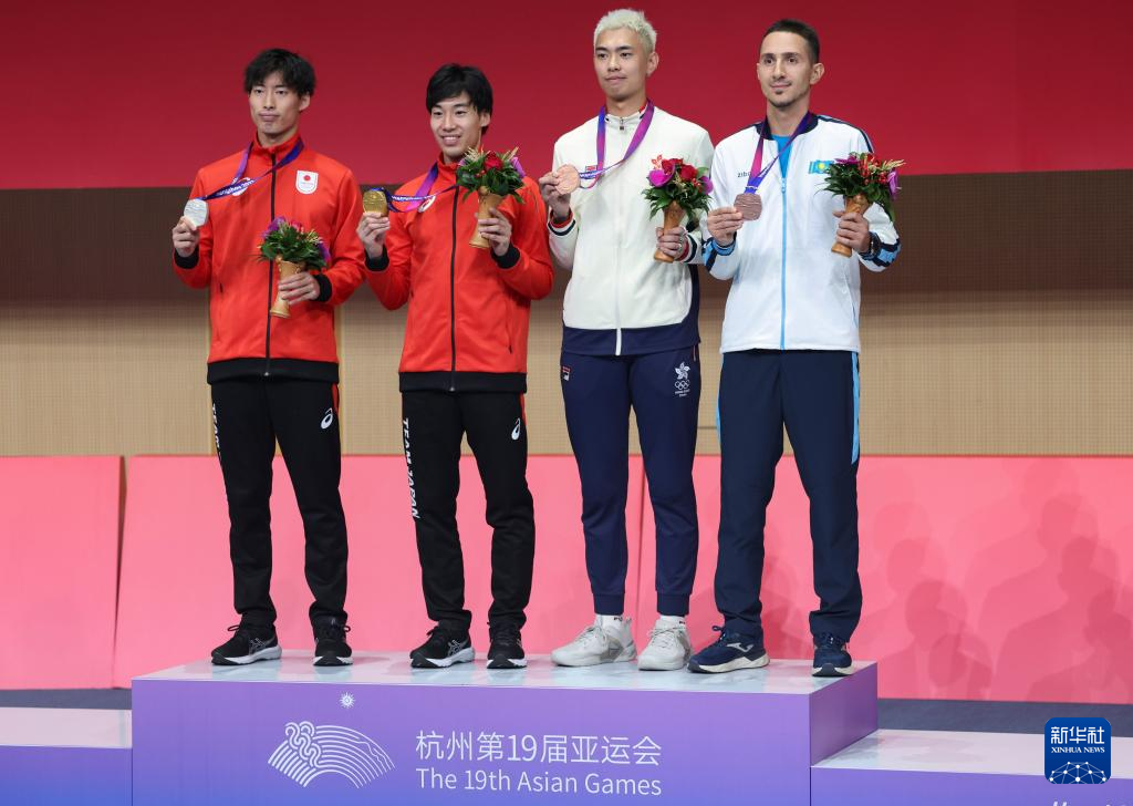 26日、表彰式に臨む古俣聖、加納虹輝、何瑋桁、エルミル・リマジャノフ(左から)。(杭州=新華社記者/徐昱)