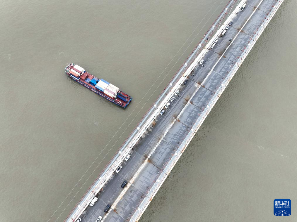 23日、建設が進む南京仙新路長江大橋の下を通る船舶。(小型無人機から、南京=新華社記者/季春鵬)