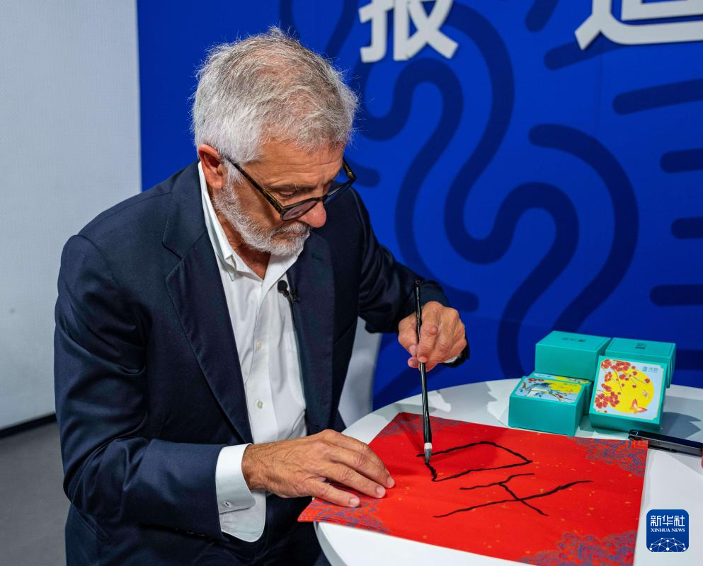 25日、インタビュー後に祝福の文字を記すサマランチ副会長。(杭州=新華社記者/孫非)pagebreak