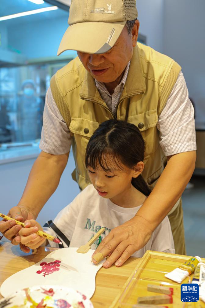 24日、上海市嘉定区婁塘古鎮で扇子に絵付けをする外国人の子ども。(上海=新華社記者/辛夢晨)