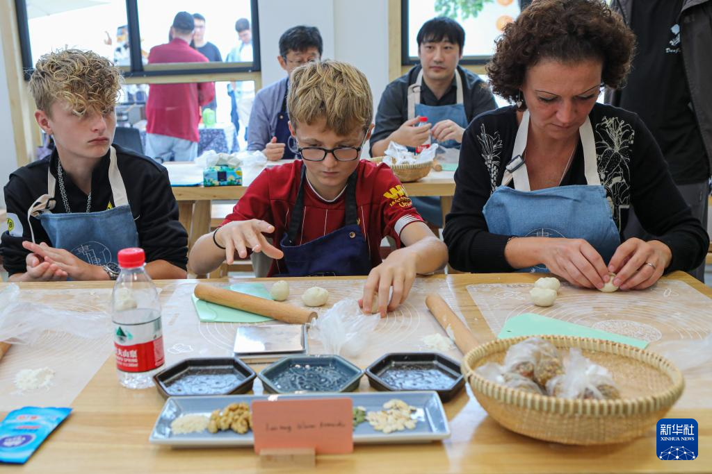 24日、上海市嘉定区婁塘古鎮で月餅作りを体験する外国人。(上海=新華社記者/辛夢晨)pagebreak
