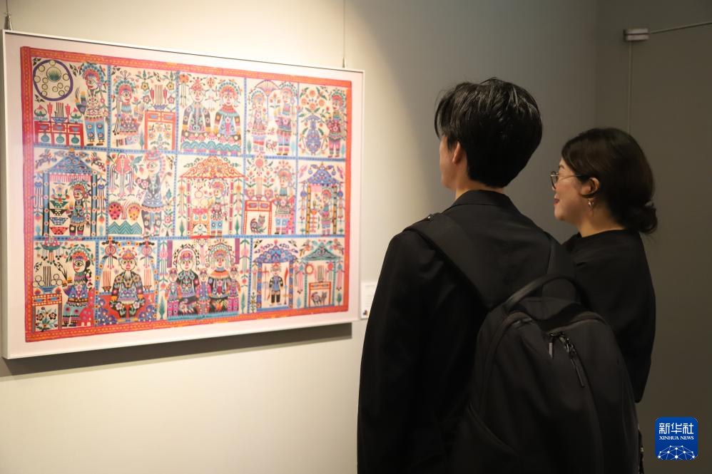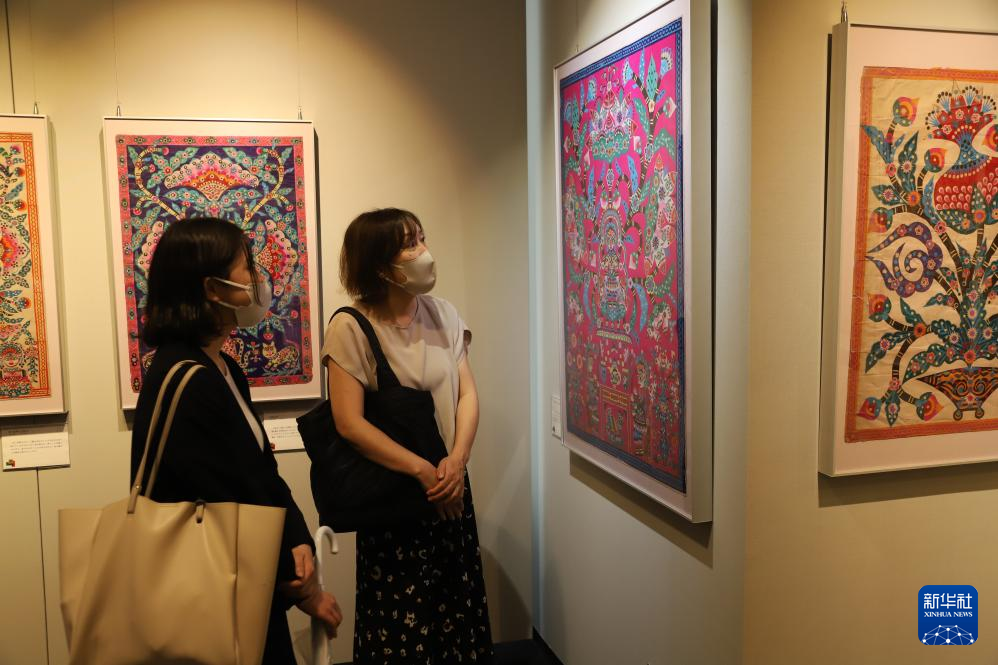 21日、庫淑蘭切り絵展の内覧会で作品を鑑賞する来場者。(東京=新華社記者/姜俏梅)