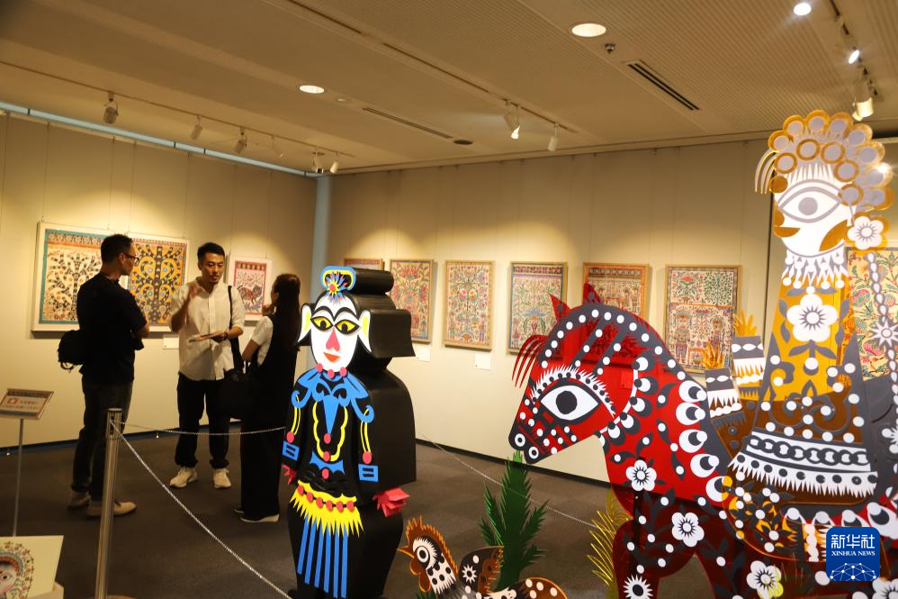 21日、庫淑蘭切り絵展の内覧会で、陝西省美術博物館の訪日メンバーと交流する来場者。(東京=新華社記者/姜俏梅)pagebreak