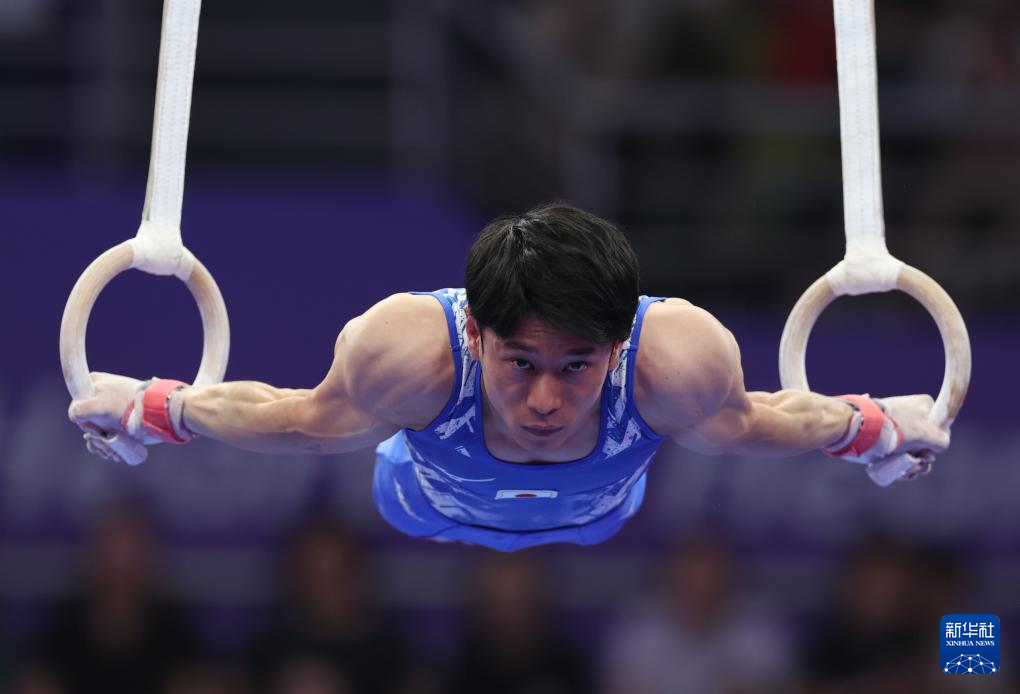28日、つり輪の演技をする日本の谷川航。(杭州=新華社記者/程婷婷)
