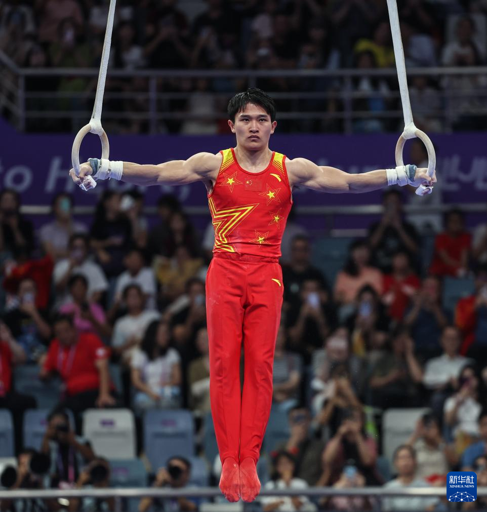 28日、つり輪の演技に臨む中国の蘭星宇。(杭州=新華社記者/朱崢)