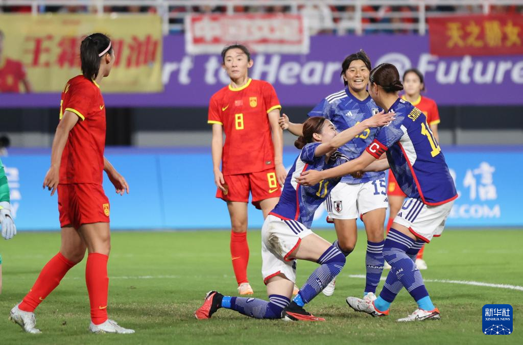 3日、準決勝でゴールを決め、チームメイトと喜ぶ中嶋淑乃(右から2人目)。(杭州=新華社記者/賈浩成)